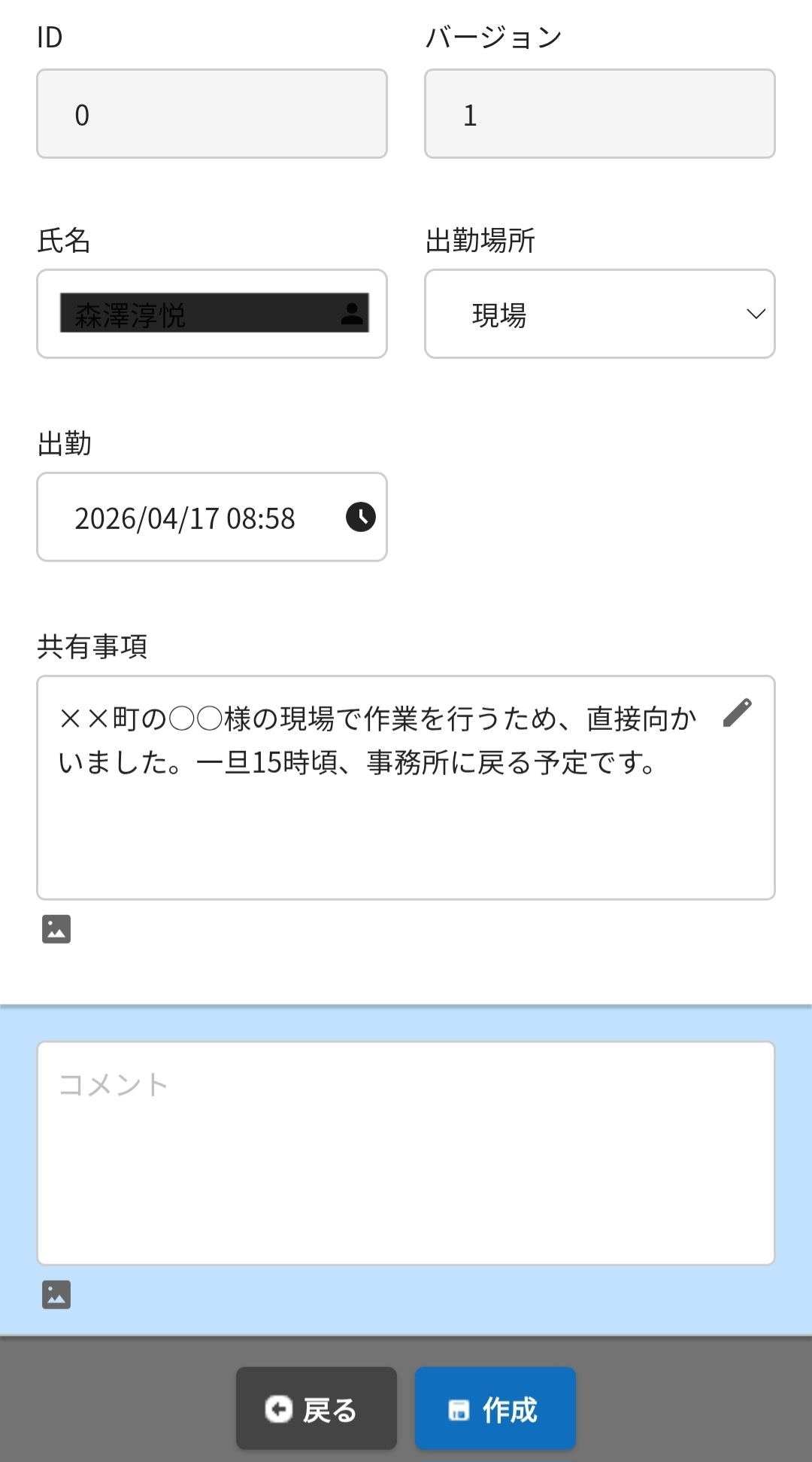 簡単な例として、スマートフォンで出退勤を記録するシーンを想定したフォームを作ってみました。