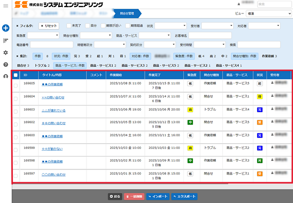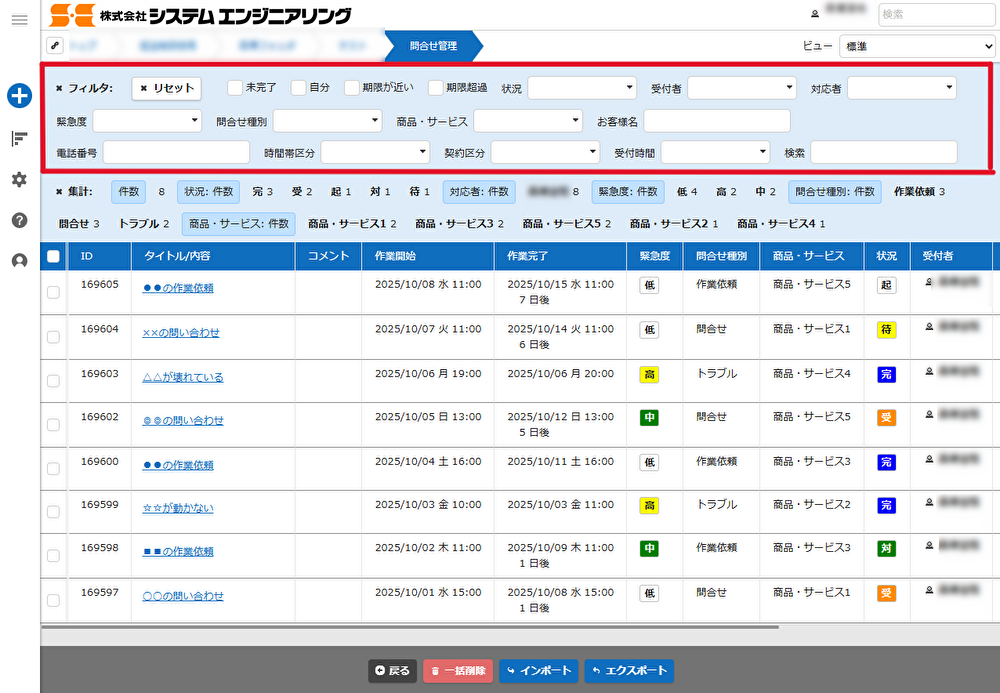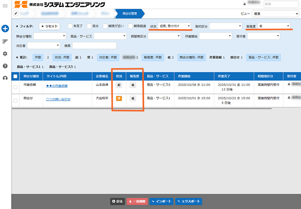フィルタで絞り込むと、右のようになります。「状況」が「起票 or 受け付け」、「緊急度」が「低」という条件に当てはまるデータのみが表示されています。大量なデータから、必要なデータをすぐに得ることができます。