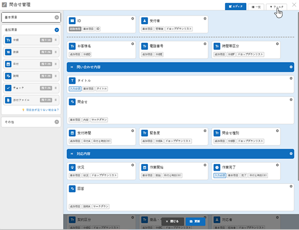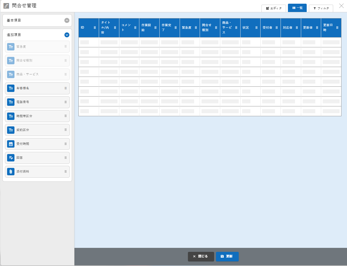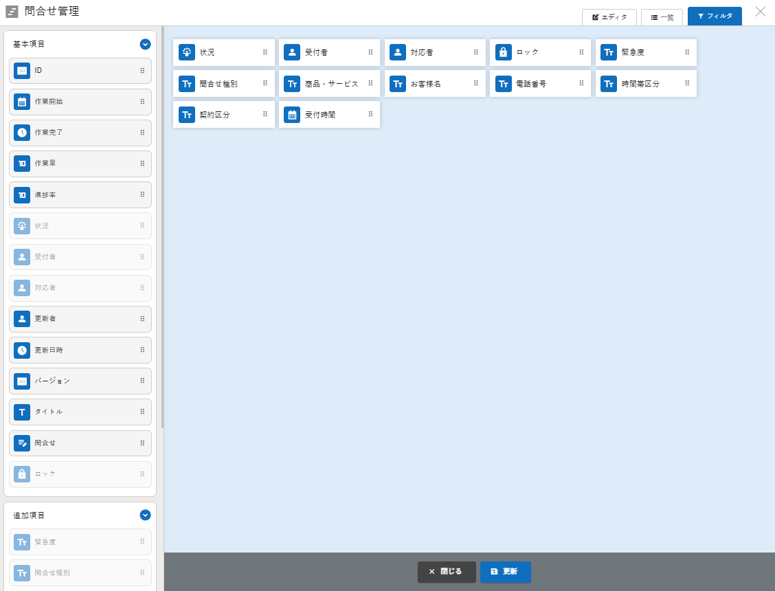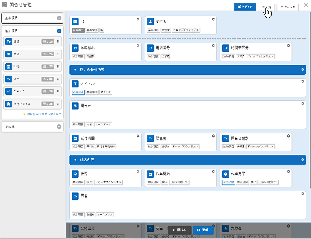 前編で作成した「問合せ管理」の入力フォームは、初期状態のままだと上記のような一覧が形成されます。ただ、よく見ると「お客様名」の項目が一覧に入っていないため、一目では誰からの問い合わせなのかが分からない状態になっています。一覧の出力項目の設定・並び替えの手順は以下の通りになります。