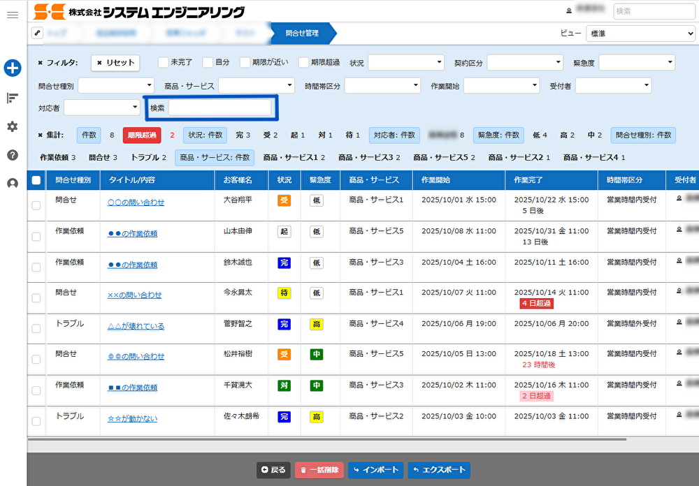 これでフィルタ部分の設定も完了です。なお、青枠の「検索」は、自動反映されるフィルタで、テーブル内全体の中での文字列検索となっています。「お客様名」「タイトル」「電話番号」「日時」など多岐にわたる検索ができるので、非常に重宝します。